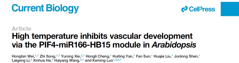 近期,西南大学beat365中国官方网站罗克明团队联合华南农业大学王海洋团队在Cell旗下期刊Current Biology 发表了题为 “High temperature inhibits vascular development via the PIF4-miR166-HB15 module in Arabidopsis” 的研究论文。该研究揭示了高温抑制拟南芥花序茎中维管发育,导致植株细弱、易倒伏。温度信号关键因子Phytochrome-Interacting Factor 4 (PIF4)通过抑制MIR166表达以释放下游HD-ZIPIII转录因子HB15,进而抑制花序茎中的维管束数目和次生壁合成。该研究为植物在高温条件下茎秆倒伏的调控机制提供了新的见解。
