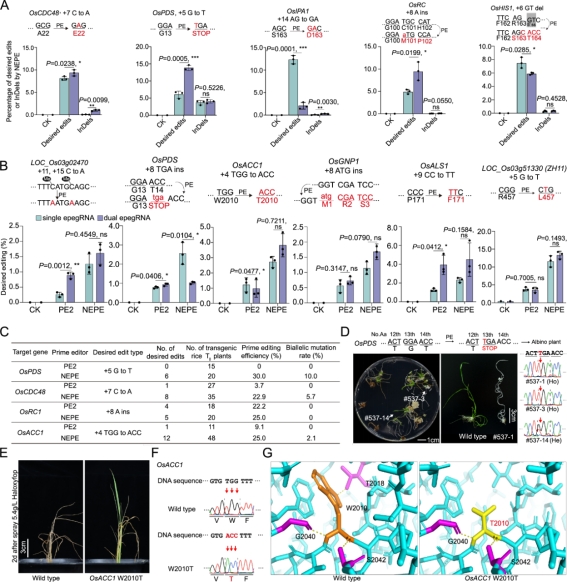 基于蛋白质元件优化,设计构建了4种水稻引导编辑PE2系统(图1A),并在水稻原生质体中对四种PE2系统的编辑效率进行了快速评价。经通量测序分析表明,在所选择已报道的3个位点处,N-PE2系统编辑效率最高,平均编辑效率约为10%(图1B)。而选用epegRNA(pegRNA+ EvopreQ1)可极大地提升编辑效率(图1B-D)。因此,将N-PE2+epegRNA命名为NEPE系统。值得一提的是,在所测试的OsALS1位点处,NEPE系统较此前发表的ePEmax2系统编辑效率更高(图1E)。上述结果表明,引导编辑器融合蛋白结构的简单变化结合epegRNA可以极大地提升水稻中的引导编辑效率。