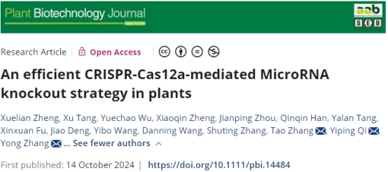 近日,Plant Biotechnology Journal杂志在线发表了由西南大学/电子科技大学张勇课题组及其合作团队撰写的“An efficient CRISPR-Cas12a mediated MicroRNA knockout strategy in plants”论文。该研究工作通过比较CRISPR-Cas12a和CRISPR-Cas9编辑系统敲除水稻非编码基因OsMIR390的效果,证实了Cas12a比Cas9更适合有效敲除MicroRNA(miRNA)基因并产生可靠的功能缺失突变体。进一步,对水稻多个miRNA基因进行定向编辑,成功获得功能缺失的突变体,揭示了这些miRNA在生长发育、籽粒大小、品质调控等方面的新功能。研究团队报道的这一基于CRISPR-Cas12a的有效植物miRNA敲除策略,为深入解析植物miRNA生物学功能及进行分子育种事件提供了明确的编辑工具、编辑策略及水稻miRNA新种质材料。