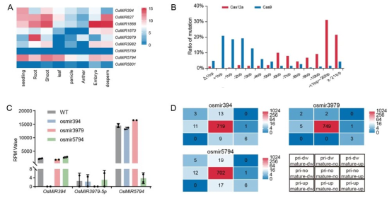 图2CRISPR-Cas12a系统高效特异的敲除水稻OsMIRNA基因