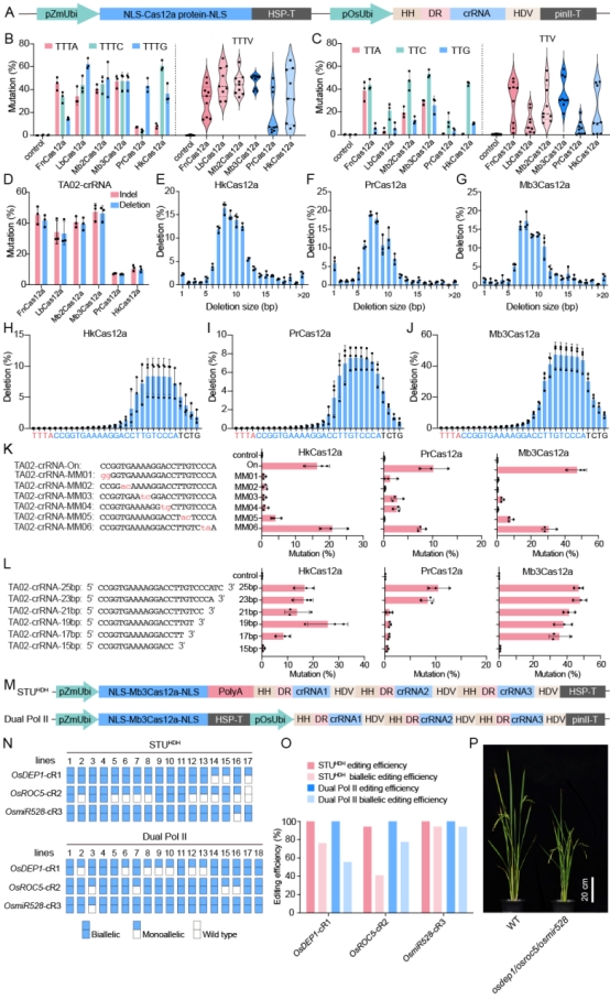 该研究对比测试了源于Helcococcus kunzii、Moraxella bovoculi、Pseudobutyrivibrio ruminis的CRISPR-HkCas12a、CRISPR-Mb3Cas12a, CRISPR-PrCas12a系统的编辑活性及特性。结果显示,3种核酸酶均表现出编辑活性,其中Mb3Cas12a在所有5’-VTTTV-3’ PAM位点上的平均编辑效率达到40.0%以上,与LbCas12a相当。在5’-VTTV-3’ PAM位点上也有高效的编辑活性(平均编辑效率也达到40.0%以上)(图1A-1C)。Mb3Cas12a在crRNA长度为19到23nt时可以产生有效编辑;主要诱导在PAM远端13到27nt处的多碱基删除,删除大小为6bp-12bp;在错配表现上也体现了明确的高特异性(图1D-1L)。基于Mb3Cas12a的单Pol II启动子的STUHDH和双Pol II启动子的Dual Pol II多基因共编辑系统,在3个水稻内源基因靶位点(OsDEP1-crR1、OsROC5-crR2、OsmiR528-crR3)上产生了94.1%-100%的突变,并且大多数植株在3个靶基因上产生了共编辑(图1M-1P)。