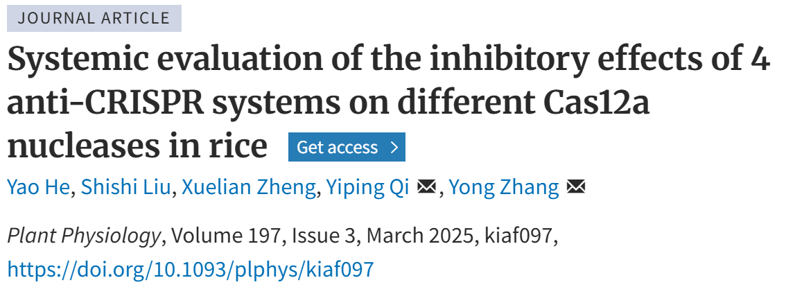 CRISPR-Cas系统的出现推动了基因组编辑的革命性发展,其中II型和V型系统应用最广泛。为对抗该防御机制,噬菌体进化出Anti-CRISPR蛋白(Acr),目前已知5种V-A型AcrVA蛋白,其中AcrVA1和AcrVA5在烟草和水稻中证实能抑制LbCas12a与Mb2Cas12a核酸酶的编辑及调控活性。然而,不同AcrVA蛋白对其他Cas12a同源蛋白的抑制作用仍需深入研究。2025年3月27日,Plant Physiology杂志在线发表了西南大学张勇课题组题为 “Systemic evaluation of the inhibitory effects of 4 anti-CRISPR systems on different Cas12a nucleases in rice”的研究论文。