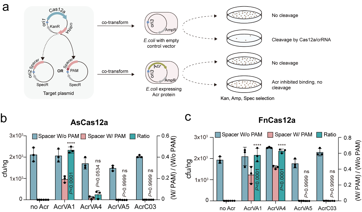 应用质粒干扰实验在大肠杆菌中研究不同Acr蛋白对AsCas12a和FnCas12a的抑制效果(图1a)。实验结果表明,对于AsCas12a,AcrVA1显示出最明显的抑制效果,其次是AcrVA4,而AcrVA5和AcrC03在大肠杆菌中几乎没有显示出任何抑制活性(图1b);FnCas12a被AcrVA1和AcrVA4强烈抑制,而AcrVA5和AcrC03蛋白在大肠杆菌中未能显示出抑制活性(图1c)。