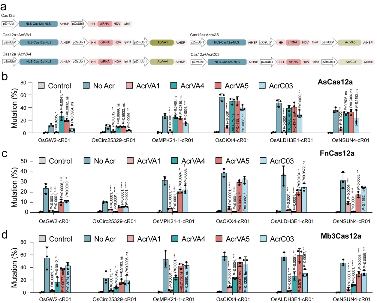 该研究基于type V Acr蛋白与不同Cas12a同源蛋白,设计了type V型Acr蛋白和Cas12a核酸酶共表达策略的植物基因组编辑新系统,分析Acr蛋白对Cas12a植物基因编辑活性和特异性的影响,实现了水稻内源基因高特异性有效编辑,进一步丰富了植物基因组编辑工具库。全文主要结果简述如下: