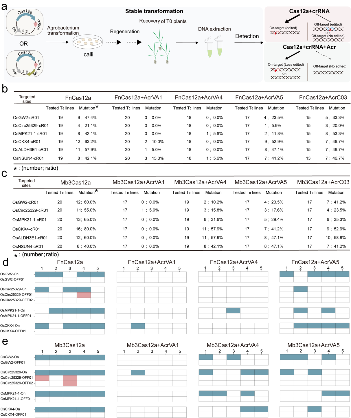 3、 Acr蛋白在植物中阻止FnCas12a及Mb3Cas12a介导的基因组编辑及降低脱靶效应