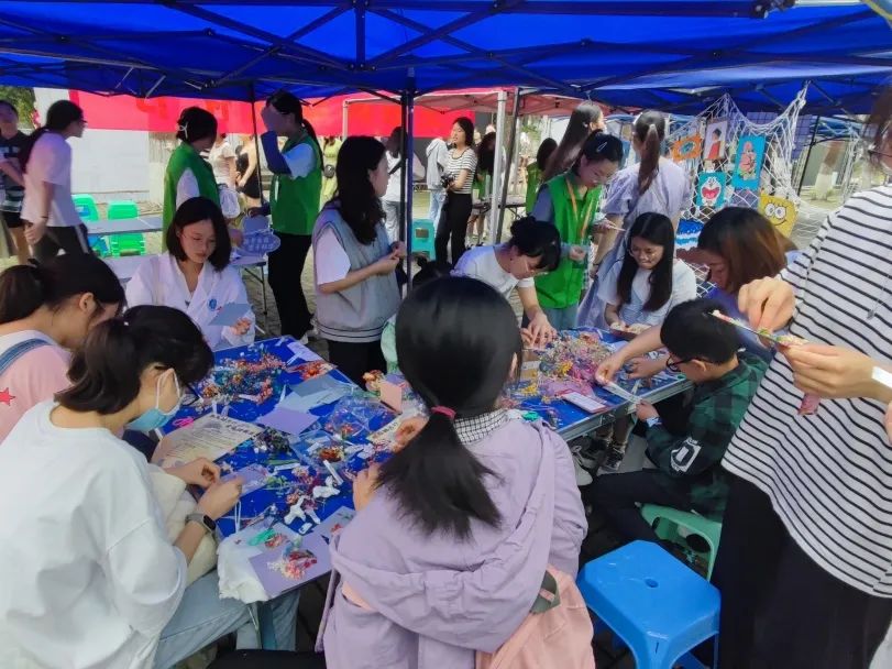 在学校樟树林挺拔的香樟下,志愿者们带领植物爱好者学习植物分类学知识,旁边的展位上,一些路过的游客正在体验制作植物拓印、叶脉书签等手工艺品。