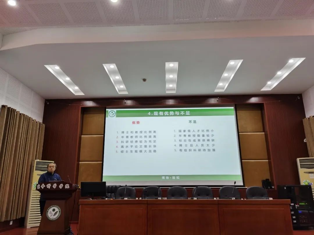 廖志华副院长作关于学院2022年科研事业发展的工作报告。报告比较和分析了学院近三年教学科研人员基本情况、新增科研项目情况和科研成果产出情况,总结了学院科研方面的优势在于博士和教授比例高、科研经费较为充足、高水平论文增长快、青年教师比例大幅度提高等,同时指出学院科研事业发展需要进一步在培养国家级人才、取得重大标志性成果、提升年轻教授比例等方面取得更大突破。