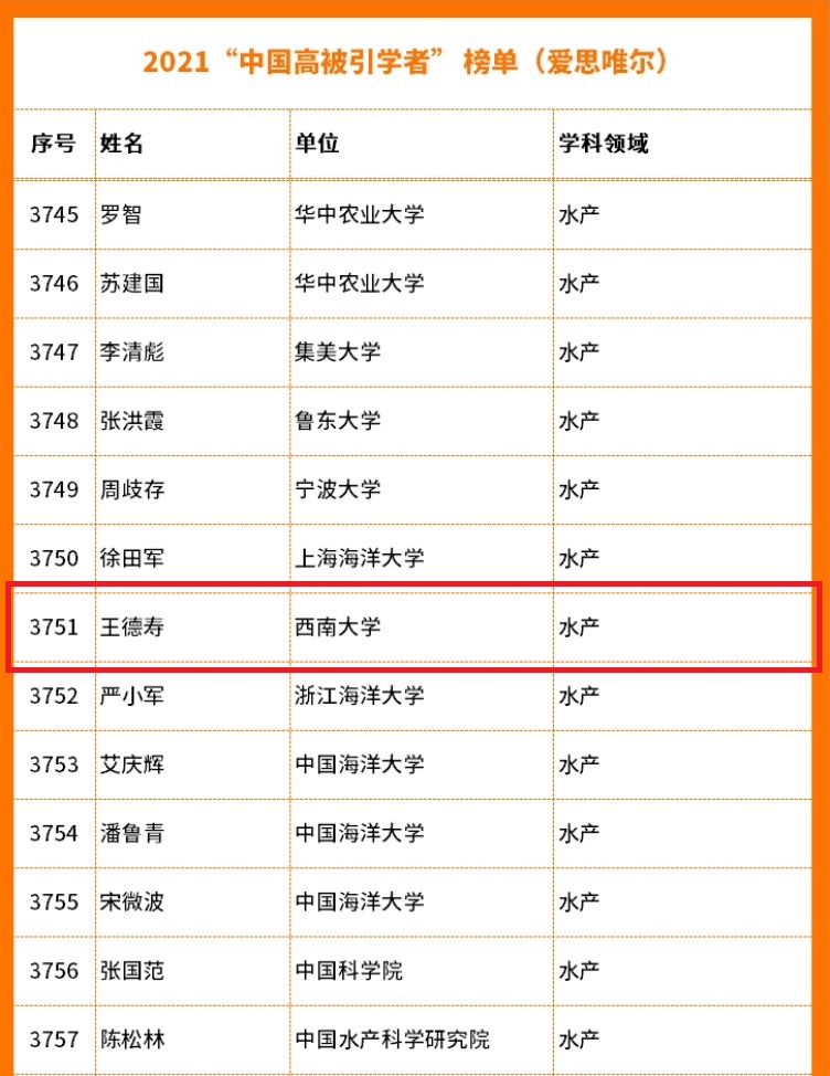 2021年中国高被引学者来自523所高校、企业和科研机构,其中西南大学拥有“高被引学者”13位,beat365中国官方网站王德寿教授成功入选。