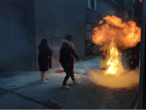 在消防安全疏散演练过程中,同学们在疏导员的指引下弯腰屈身、湿毛巾捂鼻,快速而有序地从高楼层按照指定路线撤离到安全地带。接着保卫处的老师向同学们讲解灭火器使用的注意事项及正确使用方法。谷彩霞老师首先进行了灭火操练,随后同学们依次有序地按照讲解的动作要领进行模拟灭火,对“起火点”实施有效扑救。
