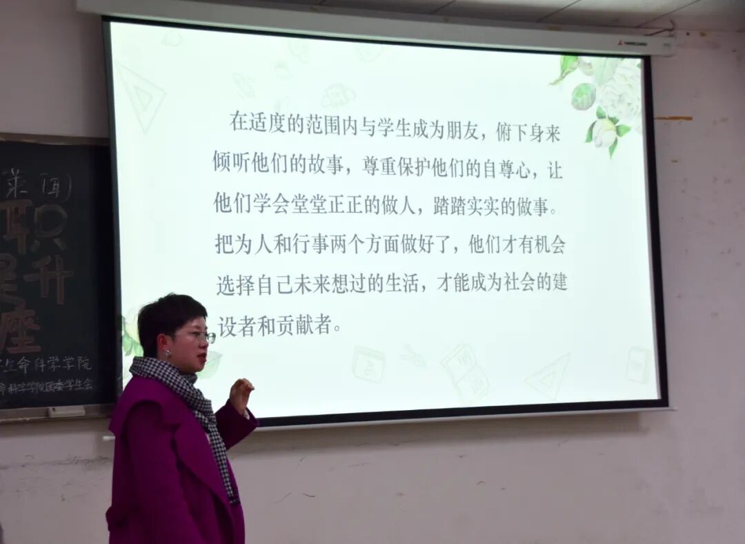 最后,李老师说,班主任的世界很小,小到你的世界里每天都只有一个人和你生活,那就是学生。而你每天都在他们的身后捡拾那些看似微小的事情,它们如芝麻般大小,却丰富了你的人生。但班主任的世界又很大,大到你的世界里每天有不同的人和你生活,那就是学生。他们因成长的磨砺而变得光彩夺目。而班主任就成了这个世界上拥有珍珠最多的人,一伸手便满掌光芒。在互动环节,同学们就班主任工作中的细节积极向李老师请教,李老师都一一作答。