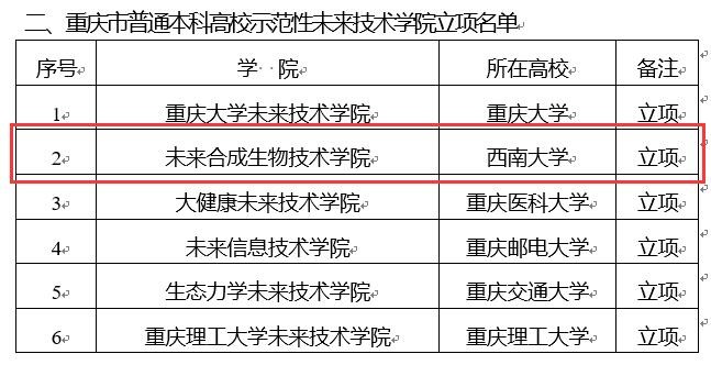 近日,重庆市教育委员会和重庆市财政局联合发布了《关于公布普通本科高校示范性新型学院(基地)建设项目立项(培育)名单的通知》(渝教高发〔2021〕17号),确定beat365中国官方网站申报建设的未来合成生物技术学院入选重庆市普通本科高校示范性未来技术学院。此次全市共有20个现代产业学院立项建设普通本科高校示范性现代产业学院,6个未来技术学院立项建设普通本科高校示范性未来技术学院。