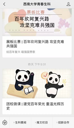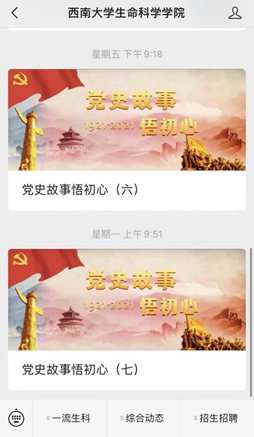 学校党史学习教育动员大会召开后,学院第一时间在微信公众号、网站专门开辟专栏,依托西南大学beat365中国官方网站官方微信、青春生科两个新媒体平台,分别推出了《党史故事悟初心》系列党史学习教育栏目和《团校微课:建党百年荣光,重温光辉历史》,截止目前累计推送七期,以青年人喜闻乐见的形式,发动各党支部接力,讲述党史故事,分享“青年党员说”,带领全院师生读好、学好、讲好党史故事,从历史风华感悟初心使命,牢记责任担当。