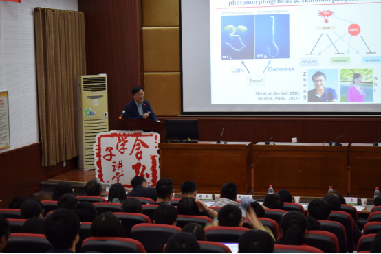 邓兴旺院士在专题报告中,通过回顾自己在研究生和博士后阶段的研究工作,深入浅出地分享了其早期在研究光调控植物生长发育机理中的曲折历程和背后故事,并最终于1991年首次发表了在光调控植物生长发育中发挥重要作用的COP1基因。随后,邓院士通过展示植物种子在发育过程中突破不同环境的土壤获得生长的过程,生动形象地介绍了其工作在农业生产等方面的运用。最后,邓院士向在座同学推荐了其主编的系列植物生物学科普丛书,向今后有志于到北京大学现代农业研究院从事植物生物学研究的同学们表示欢迎。在提问环节中,邓院士与现场师生进行了富有启发、热情友好的互动交流。